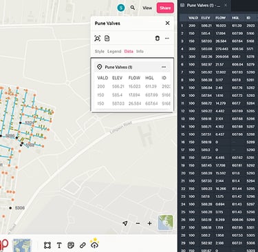 Interactive Map: Pipelines displayed with flow-based color gradients; junctions and nodes marked for clarity. Metadata Panel: Auto-updates with technical parameters (e.g., node elevation, roughness, number, flow rate). Layer Controls: Users toggle pipes, junctions, and sub-networks for focused analysis. CSV Import: Quick model-to-field validation with visual overlays.